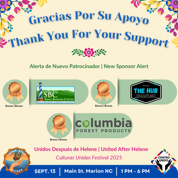 Join us on September 13th for the United After Helene: Culturas Unidas Festival 2025 in downtown Marion. After the storm comes unity. This festival is a tribute to our resilience, culture, and community, featuring an afternoon full of music, traditional dances, local vendors, raffles, a special vigil, and fun for the whole family.